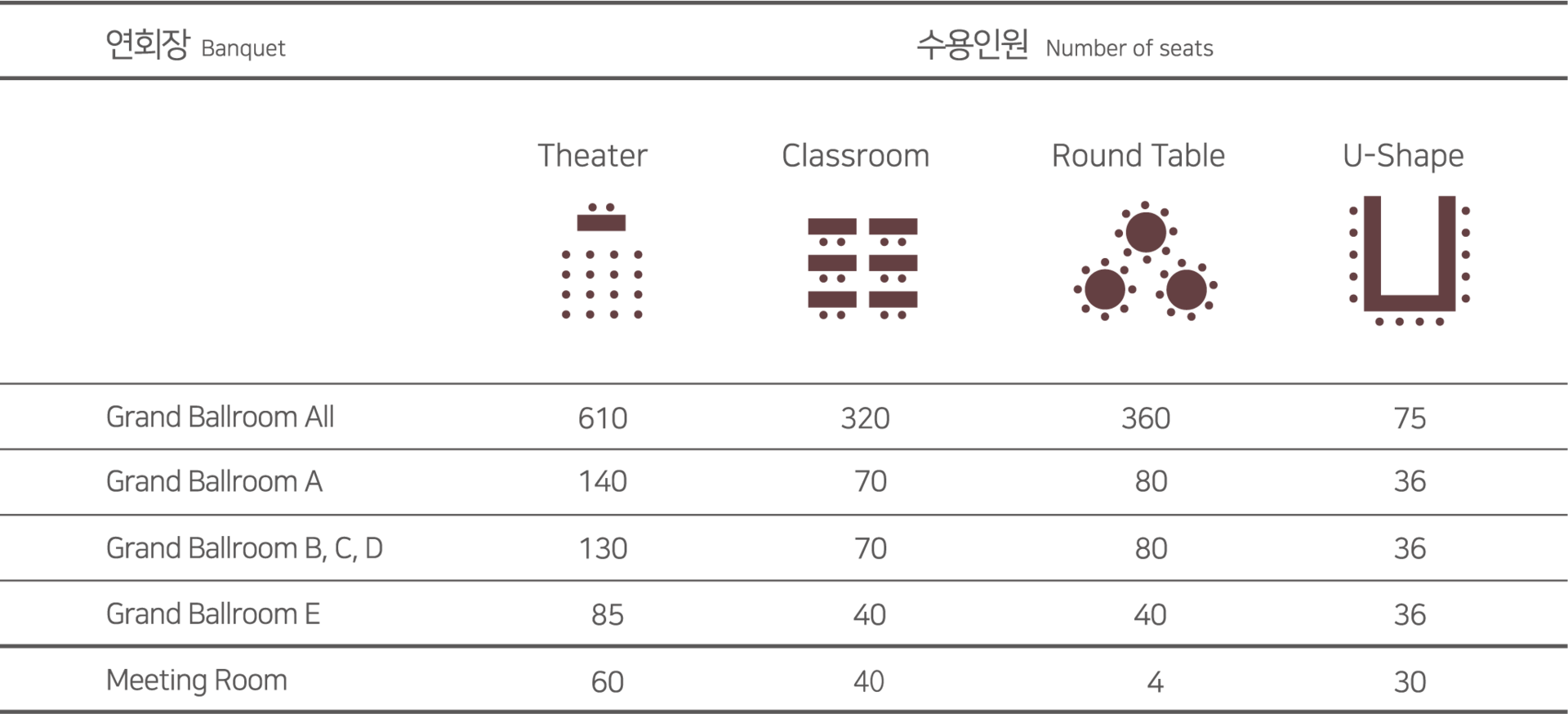 품격 있는 가족 모임 및 연회, 컨퍼런스를 비롯한 각종 비즈니스 행사를 위한 최적의 공간과 서비스를 제공해 드립니다. 또한, 연회장 로비가 독립적으로 마련되어 있어 여유로운 칵테일 리셉션을 동반한 만찬 행사 진행에도 안성맞춤입니다.